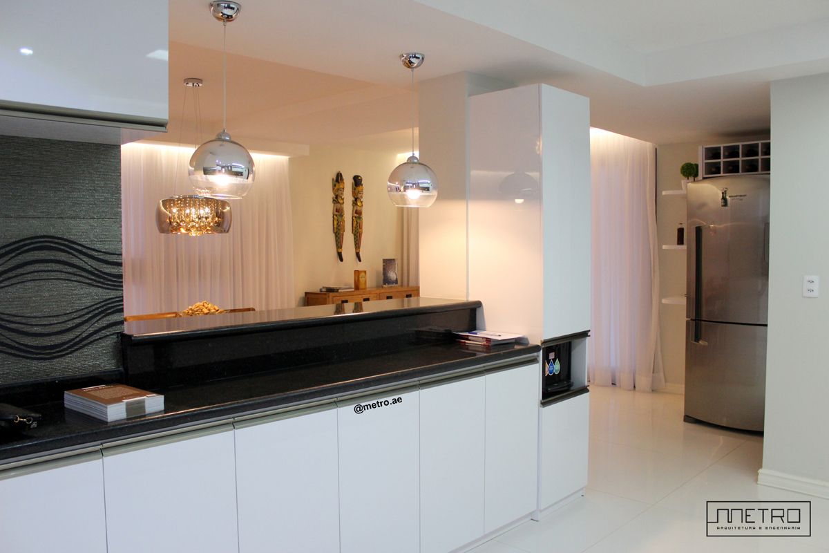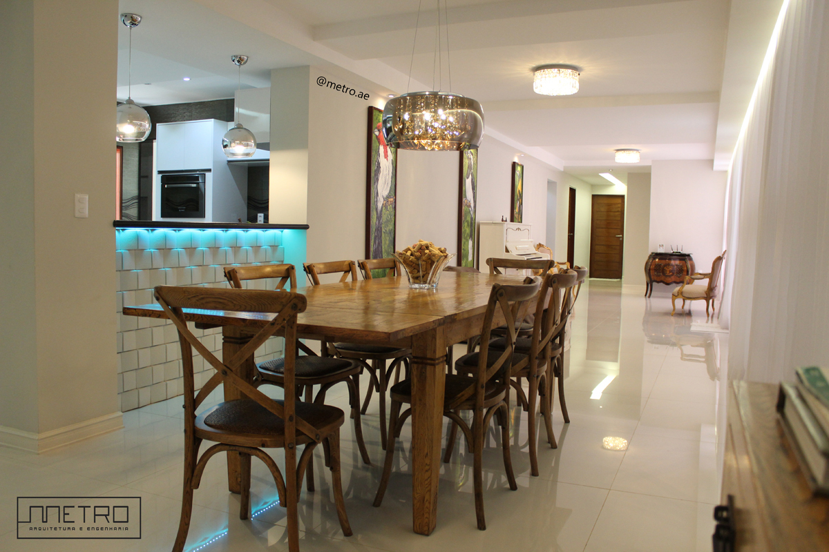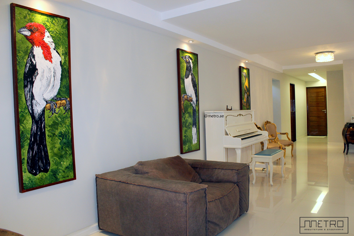 Com a mistura de elementos, trouxemos um toque eclético ao ambiente, sem fugir da sofisticação e identidade dos clientes, e como resultado temos essa sala super elegante de tirar o fôlego. Paredes, piso e teto claros, trouxeram leveza ao ambiente, proporcionando maior destaque as telas e aos móveis clássicos.